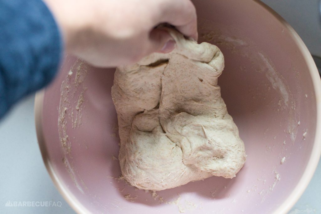 • Perform 1 set of stretch and folds: grab dough sides, fold to center, rotate bowl, repeat for all 4 sides.