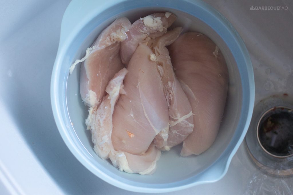 If you brined the chicken, take the chicken out of the brine and rinse in the sink to remove excess salt.