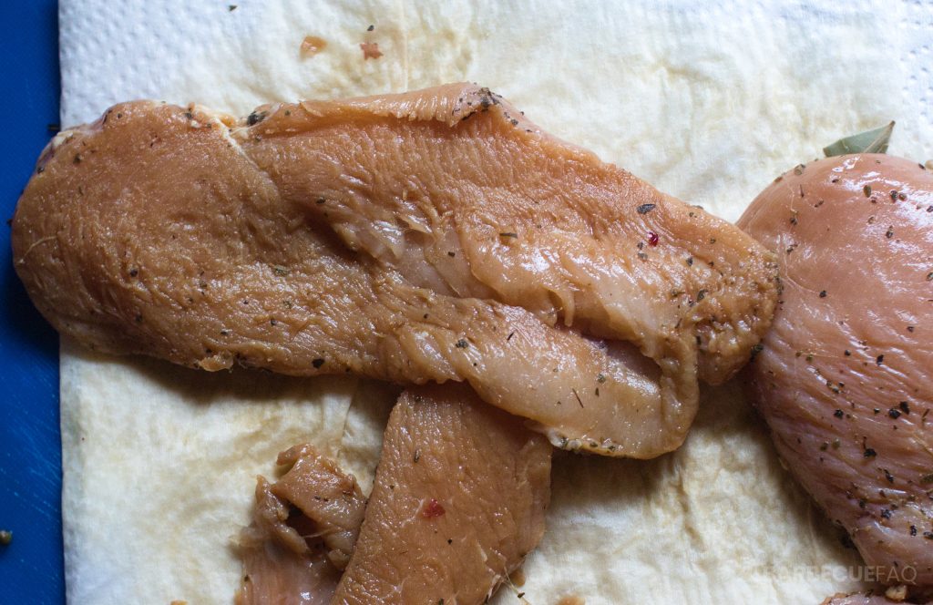 - Remove chicken from marinade and pat completely dry, wiping off any bay leaves, peppercorns, or oregano.