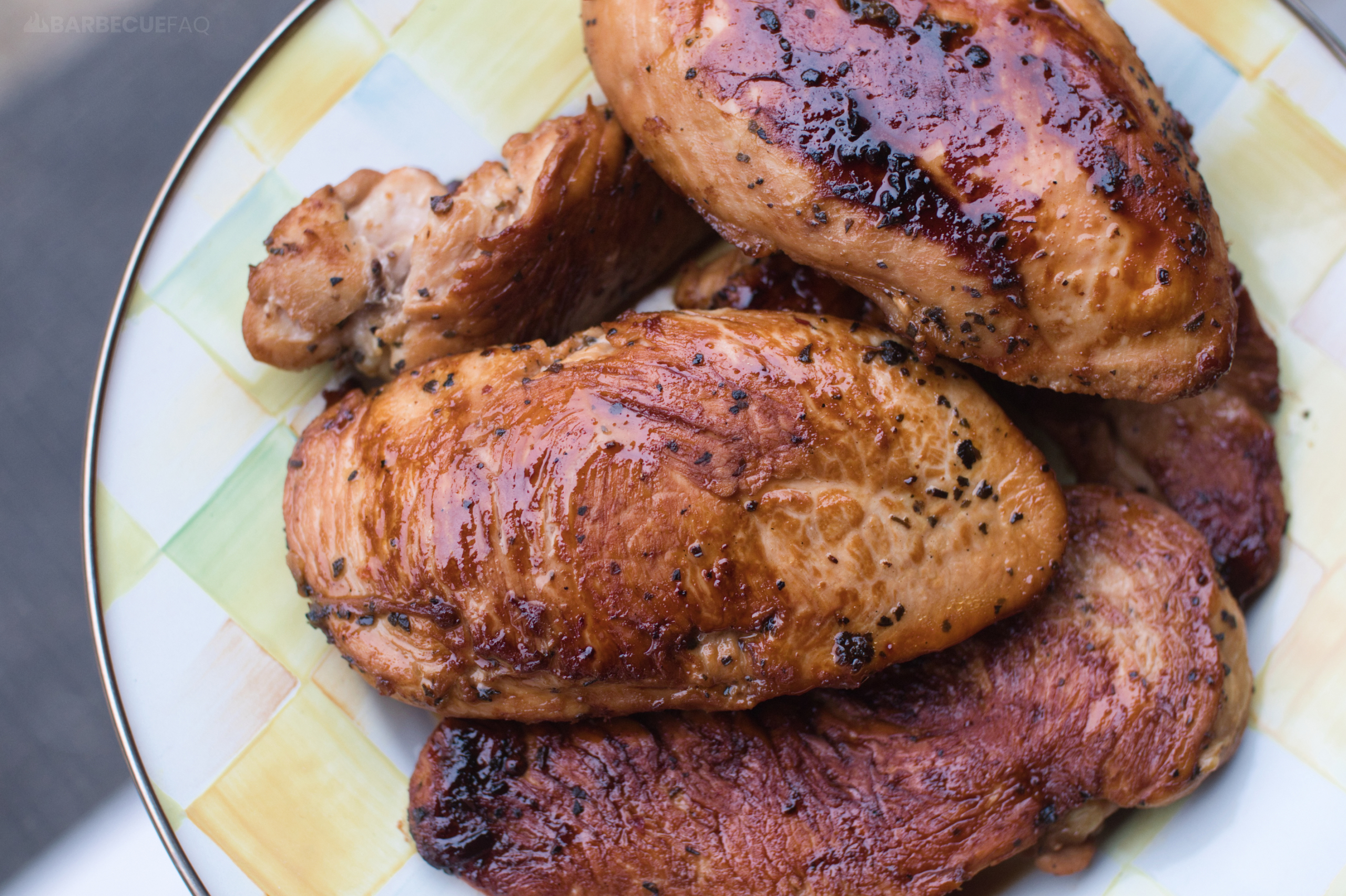 I’d strongly suggest halving the breasts so that more of the marinade can penetrate. It will also be to your benefit as the exterior crust is apt to burn/turn bitter before the internal temperature reaches ~155F.