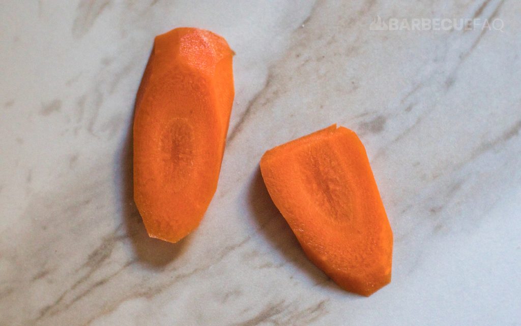 - Peel carrots and slice on bias to 1/2 inch thickness.