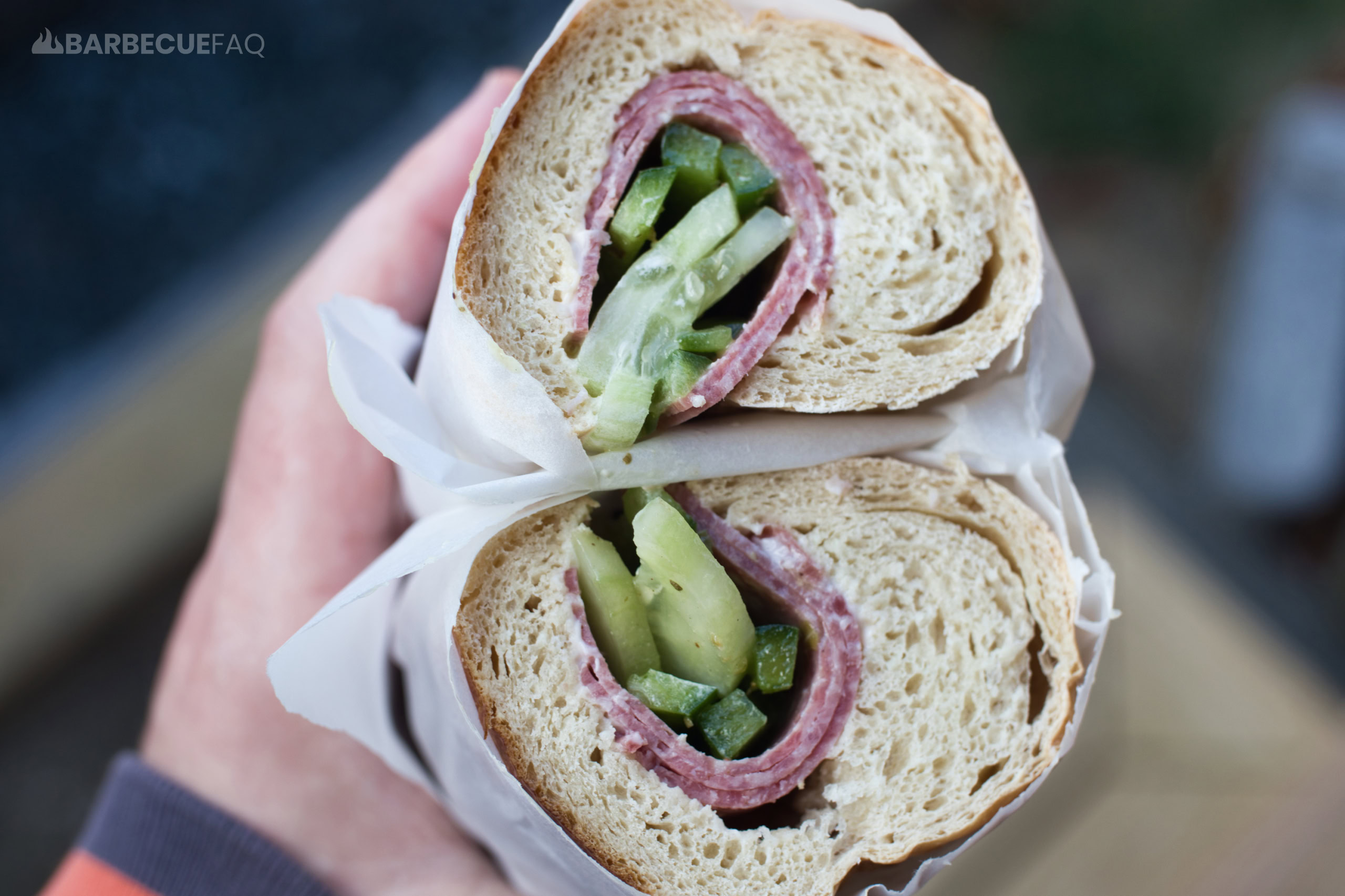 Layer cotto salami, oiled cucumbers and peppers, optional tomato, and lettuce.