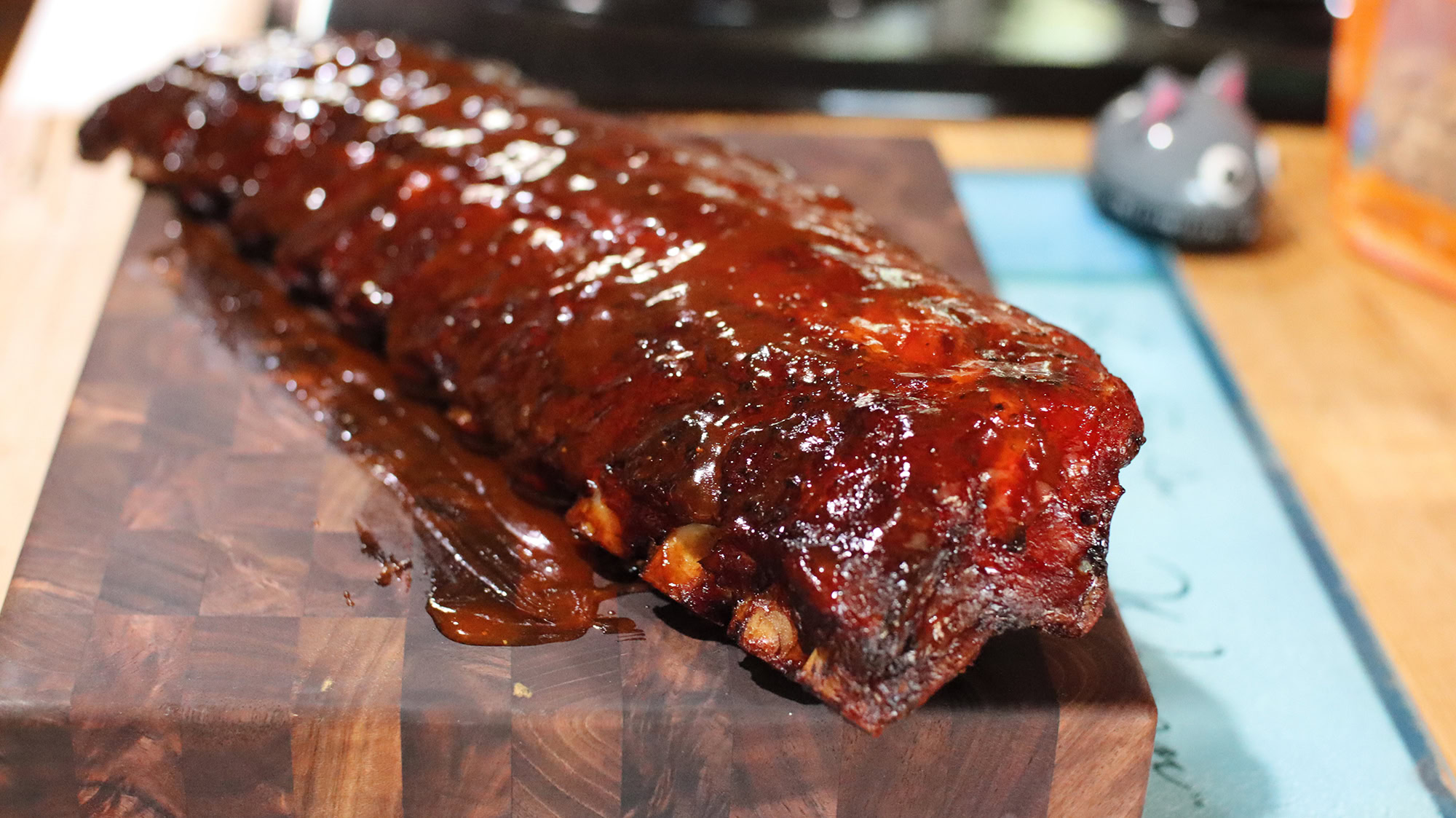 After 30 minutes start to check doneness. I usually use the twist/tear method with a center bone to see if the meat is pulling away from the bone. However, using a temperature probe to poke between the bones works best. If it feels like you're sliding through hot butter, they're done. The finish temperature is usually between 195 - 205F. This process took another hour for a total cook time of 3 hours.